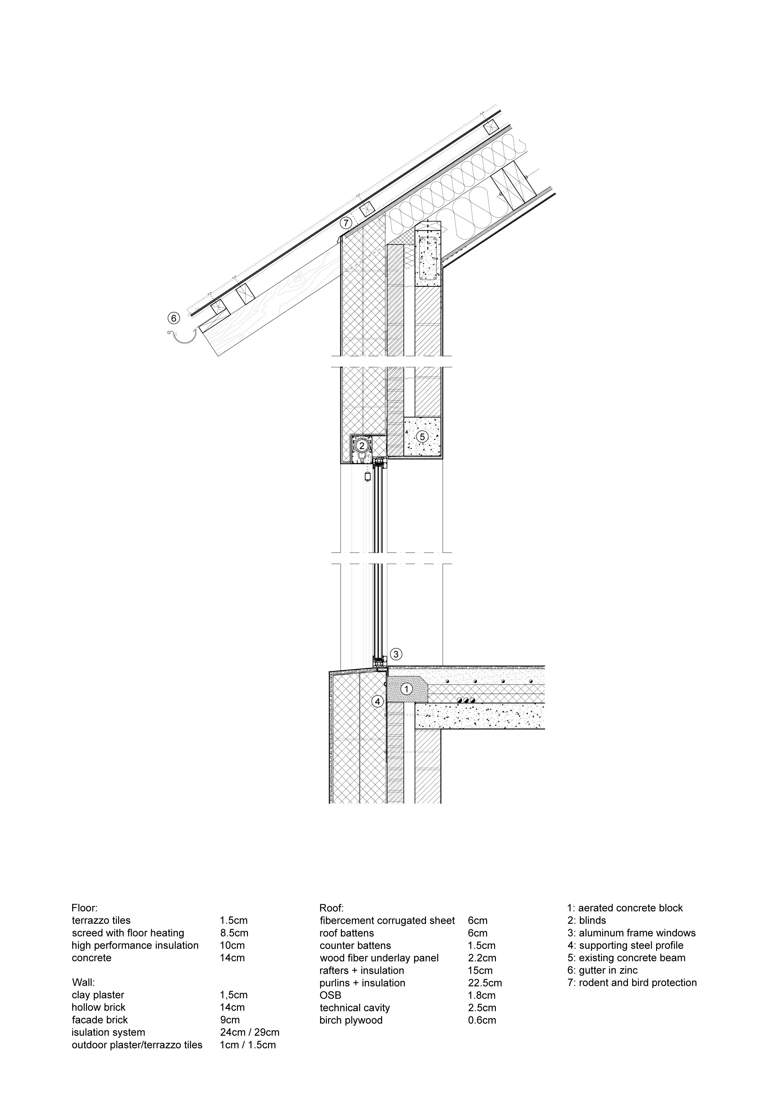 The ground floor, elevated about a meter above terrain level due to cost-saving measures in the original design requiring only a half-basement excavation, is cleverly utilized. The ground floor area, facade below zero level, and an added terrace are all clad in a uniform solid material, making the house appear as if it stands on a massive mineral foundation amidst a lush garden. This garden serves as a productive landscape, with space for vegetable gardening, small livestock, and fruit trees, with remaining areas left to nature. By aiming for higher building density, social programming, energy efficiency, and ecological value, we seek to reclaim the urban potential of the ‘Verkavelingswoning’ and bring it into the future.